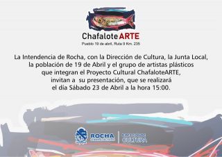 21-04-2022 El Gobierno Departamental de Rocha realiza una invitación abierta a participar de la presentación del proyecto cultural ChafaloteARTE que se realizará el día sábado 23 de Abril a las 15hs en pueblo 19 de Abril en Rocha.Dicho evento contará con la participación de mas de 20 artistas, pintores, escultores y muralistas que han trabajado en dicha propuesta y presentarán sus obras, las cuales quedarán instaladas a modo de Galería a cielo abierto en dicha localidad. El evento además contará con espectáculos musicales de artistas rochenses y jóvenes estudiantes. Ci (...)