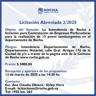 16-02-2025 Licitación Abreviada 2/2025 Objeto del llamado: La Intendencia de Rocha a licitación para Contratación de Empresas Perforadoras para la realización de 15 pozos semisurgentes en el departamento de Rocha. Pliegos: Intendencia Departamental de Rocha, Departamento Notarial, calle Gral. Artigas 176 de la Ciudad de y/o a través de la página web de la Comuna de Rocha www.rocha.gub.uy Precio: $ 5000,00