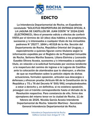 18-02-2025 EDICTO. La Intendencia Departamental de Rocha, en Expediente caratulado "SOLICITUD REAPERTURA DE ENTRADA OFICIAL A LA LAGUNA DE CASTILLOS SR. JUAN COSTA" N°2024-2245 (ELECTRÓNICO), libra el presente edicto a efectos de conferir VISTA por el términos de 10 (diez) días hábiles a los propietarios, sucesores y/o interesados a cualquier título de los inmuebles padrones N°25277, 1664 y 40318 de la 4ta. Sección del Departamento de Rocha, República Oriental del Uruguay, y especialmente a quienes figuran como titulares según la información expedida por el Registro de la Propiedad Inmueble de Rocha, Se&nt (...)