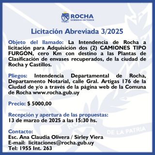 11-02-2025 Licitación Abreviada 3/2025 Objeto del llamado: La Intendencia de Rocha a licitación para Adquisición dos (2) CAMIONES TIPO FURGÓN, cero Km con destino a las Plantas de Clasificación de envases recuperados, de la ciudad de Rocha y Castillos. Pliegos: Intendencia Departamental de Rocha, Departamento Notarial, calle Gral. Artigas 176 de la Ciudad de y/o a través de la página web de la Comuna de Rocha www.rocha.gub.uy Precio: $ 5000,00