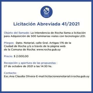 11-10-2021 Licitación Abreviada 41/2021 Objeto del llamado: La Intendencia de Rocha llama a licitación para Adquisición de 500 luminarias viales con tecnología LED. Pliegos: Dpto. Notarial, calle Gral. Artigas 176 de la Ciudad de Rocha y en la Oficina de la IDR y/o a través de la página web de la Comuna de Rocha: www.rocha.gub.uy Precio: $ 2.000,00 Recepción y apertura de las propuestas : 27 de octubre de 2021 a las 14:30 hs. Contacto: Esc.Ana Claudia Olivera - E-mail: licitacionesnotarial@rocha.gub.uy (...)