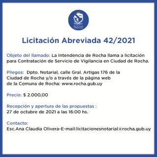 11-10-2021 Licitación Abreviada 42/2021 Objeto del llamado: La Intendencia de Rocha llama a licitación para Contratación de Servicio de Vigilancia en Ciudad de Rocha. Pliegos: Dpto. Notarial, calle Gral. Artigas 176 de la Ciudad de Rocha y en la Oficina de la IDR y/o a través de la página web de la Comuna de Rocha: www.rocha.gub.uy Precio: $ 2.000,00 Recepción y apertura de las propuestas : 27 de octubre de 2021 a las 16:00 hs. Contacto: Esc.Ana Claudia Olivera - E-mail: licitacionesnotarial@rocha.gub.uy (...)