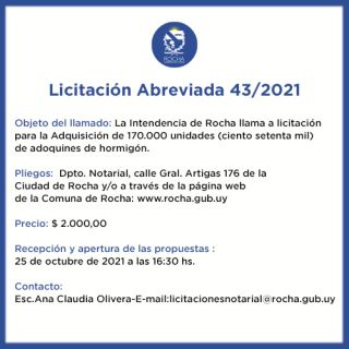 11-10-2021 Licitación Abreviada 43/2021 Objeto del llamado: La Intendencia de Rocha llama a licitación para la Adquisición de 170.000 unidades (ciento setenta mil) de adoquines de hormigón. Pliegos: Dpto. Notarial, calle Gral. Artigas 176 de la Ciudad de Rocha y en la Oficina de la IDR y/o a través de la página web de la Comuna de Rocha: www.rocha.gub.uy Precio: $ 2.000,00 Recepción y apertura de las propuestas : 25 de octubre de 2021 a las 16:30 hs. Contacto: Esc.Ana Claudia Olivera - E-mail: licitacionesnotarial@rocha.gub.uy (...)