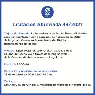11-10-2021 Licitación Abreviada 44/2021 Objeto del llamado: La Intendencia de Rocha llama a licitación para Pavimentación con adoquines de hormigón en 700m de largo por 6m de ancho en Punta del Diablo, departamento de Rocha. Pliegos: Dpto. Notarial, calle Gral. Artigas 176 de la Ciudad de Rocha y en la Oficina de la IDR y/o a través de la página web de la Comuna de Rocha: www.rocha.gub.uy Precio: $ 2.000,00 Recepción y apertura de las propuestas : 25 de octubre de 2021 a las 17:30 hs. Contacto: Esc.Ana Claudia Olivera - E-mail: licitacionesnotarial@rocha.gub.uy (...)