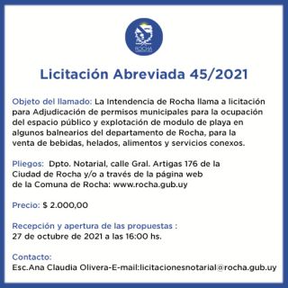 11-10-2021 Licitación Abreviada 45/2021 Objeto del llamado: La Intendencia de Rocha llama a licitación para Adjudicación de permisos municipales para la ocupación del espacio público y explotación de modulo de playa en algunos balnearios del departamento de Rocha, para la venta de bebidas, helados, alimentos y servicios conexos. Pliegos: Dpto. Notarial, calle Gral. Artigas 176 de la Ciudad de Rocha y en la Oficina de la IDR y/o a través de la página web de la Comuna de Rocha: www.rocha.gub.uy Precio: $ 2.000,00 Recepción y apertura de las propuestas : 27 de octubre de 2021 a las (...)