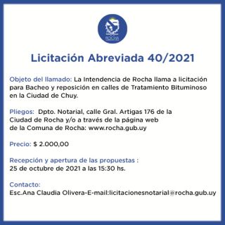11-10-2021 Licitación Abreviada 40/2021 Objeto del llamado: La Intendencia de Rocha llama a licitación para Bacheo y reposición en calles de Tratamiento Bituminoso en la Ciudad de Chuy Pliegos: Dpto. Notarial, calle Gral. Artigas 176 de la Ciudad de Rocha y en la Oficina de la IDR y/o a través de la página web de la Comuna de Rocha: www.rocha.gub.uy Precio: $ 2.000,00 Recepción y apertura de las propuestas : 25 de octubre de 2021 a las 15:30 hs. Contacto: Esc.Ana Claudia Olivera - E-mail: licitacionesnotarial@rocha.gub.uy (...)