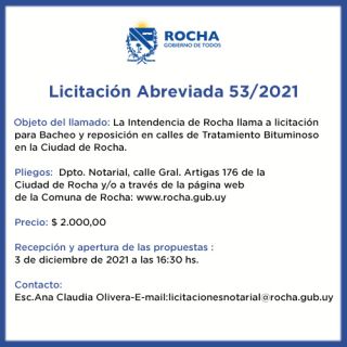 29-11-2021 Licitación Abreviada 53/2021 Objeto del llamado: La Intendencia de Rocha llama a licitación para Bacheo y reposición en calles de Tratamiento Bituminoso en la Ciudad de Rocha. Pliegos: Dpto. Notarial, calle Gral. Artigas 176 de la Ciudad de Rocha y en la Oficina de la IDR y/o a través de la página web de la Comuna de Rocha: www.rocha.gub.uy Precio: $ 2.000,00 Recepción y apertura de las propuestas : 3 de diciembre de 2021 a las 16:30 hs. Contacto: Esc.Ana Claudia Olivera - E-mail: licitacionesnotarial@rocha.gub.uy (...)