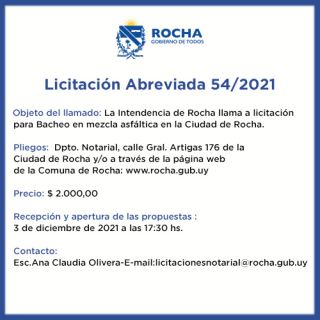 29-11-2021 Licitación Abreviada 54/2021 Objeto del llamado: La Intendencia de Rocha llama para Bacheo en mezcla asfáltica en la Ciudad de Rocha. Pliegos: Dpto. Notarial, calle Gral. Artigas 176 de la Ciudad de Rocha y en la Oficina de la IDR y/o a través de la página web de la Comuna de Rocha: www.rocha.gub.uy Precio: $ 2.000,00 Recepción y apertura de las propuestas : 3 de diciembre de 2021 a las 17:30 hs. Contacto: Esc.Ana Claudia Olivera - E-mail: licitacionesnotarial@rocha.gub.uy (...)