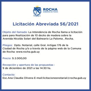 29-11-2021 Licitación Abreviada 56/2021 Objeto del llamado: La Intendencia de Rocha llama para Realización de 10 decks de madera sobre la Avenida Nicolás Solari del Balneario La Paloma , Rocha. Pliegos: Dpto. Notarial, calle Gral. Artigas 176 de la Ciudad de Rocha y en la Oficina de la IDR y/o a través de la página web de la Comuna de Rocha: www.rocha.gub.uy Precio: $ 2.000,00 Recepción y apertura de las propuestas : 9 de diciembre de 2021 a las 14:30 hs. Contacto: Esc.Ana Claudia Olivera - E-mail: licitacionesnotarial@rocha.gub.uy (...)
