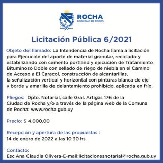 11-12-2021 Objeto del llamado: La Intendencia de Rocha llama a licitación para Ejecución del aporte de material granular, reciclado y estabilizando con cemento portland y ejecución de Tratamiento Bituminoso Doble con sellado de riego de niebla en el Camino de Acceso a El Caracol, construcción de alcantarillas, la señalización vertical y horizontal con pinturas blanca de eje y borde y amarilla de delantamiento prohibido, aplicada en frío. Pliegos: Dpto. Notarial, ca (...)