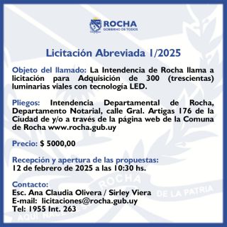 29-01-2025 Licitación Abreviada 1/2025 Objeto del llamado: La Intendencia de Rocha a licitación para Adquisición de 300 (trescientas) luminarias viales con tecnología LED. Pliegos: Intendencia Departamental de Rocha, Departamento Notarial, calle Gral. Artigas 176 de la Ciudad de y/o a través de la página web de la Comuna de Rocha www.rocha.gub.uy Precio: $ 5000,00 Recepción y apertura de las propuestas : 12 de febrero de 20 (...)
