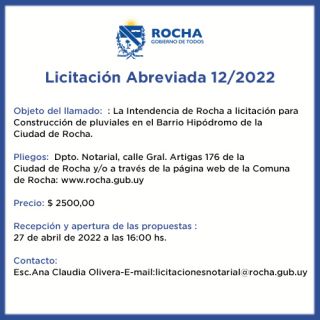 04-04-2022 Licitación Abreviada 12/2022 Objeto del llamado: La Intendencia de Rocha llama a licitación para Construcción de pluviales en el Barrio Hipódromo de la Ciudad de Rocha. Pliegos: Intendencia Departamental de Rocha, Departamento Notarial, calle Gral. Artigas 176 de la Ciudad de y/o a través de la página web de la Comuna de Rocha www.rocha.gub.uy Precio: $ 2500,00 Recepción y apertura de las propuestas : 27 de abril de 2022 a las 16:00 hs. Contacto: Ana Claudia Olivera (...)