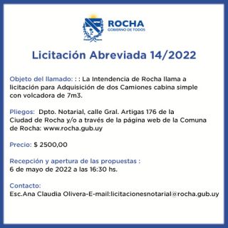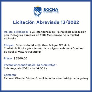 26-04-2022 Licitación Abreviada 13/2022 Objeto del llamado: La Intendencia de Rocha llama a licitación para Desagües Pluviales en Calle Monterroso de la Ciudad de Rocha. Pliegos: Intendencia Departamental de Rocha, Departamento Notarial, calle Gral. Artigas 176 de la Ciudad de y/o a través de la página web de la Comuna de Rocha www.rocha.gub.uy Precio: $ 2500,00 Recepción y apertura de las propuestas : 6 de mayo de 2022 a las 14:30 hs. Contacto: Ana Claudia Olivera- E-mail: