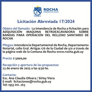 07-01-2025 Licitación Abreviada 17/2024 Objeto del llamado: La Intendencia de Rocha a licitación para ADQUISICIÓN MAQUINA RETROEXCAVADORA SOBRE BANDAS PARA OPERACIÓN DEL RELLENO SANITARIO DE ROCHA Pliegos: Intendencia Departamental de Rocha, Departamento Notarial, calle Gral. Artigas 176 de la Ciudad de y/o a través de la página web de la Comuna de Rocha www.rocha.gub.uy Precio: $ 5000,00 Recepción y apertura de las propuestas (...)