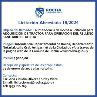 07-01-2025 Licitación Abreviada 18/2024 Objeto del llamado: La Intendencia de Rocha a licitación para ADQUISICIÓN DE TRACTOR PARA OPERACIÓN DEL RELLENO SANITARIO DE ROCHA Pliegos: Intendencia Departamental de Rocha, Departamento Notarial, calle Gral. Artigas 176 de la Ciudad de y/o a través de la página web de la Comuna de Rocha www.rocha.gub.uy Precio: $ 5000,00 Recepción y apertura de las propuestas : 23 de enero de 2025 (...)