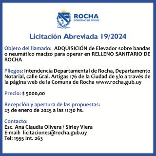 07-01-2025 Licitación Abreviada 19/2024 Objeto del llamado: La Intendencia de Rocha a licitación para ADQUISICIÓN de Elevador sobre bandas o neumático macizo para operar en RELLENO SANITARIO DE ROCHA Pliegos: Intendencia Departamental de Rocha, Departamento Notarial, calle Gral. Artigas 176 de la Ciudad de y/o a través de la página web de la Comuna de Rocha www.rocha.gub.uy Precio: $ 5000,00 Recepción y apertura de las propuest (...)