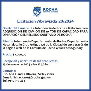 07-01-2025 Licitación Abreviada 20/2024 Objeto del llamado: La Intendencia de Rocha a licitación para ADQUISICIÓN DE CAMIÓN DE 10 TON DE CAPACIDAD PARA OPERACIÓN DEL RELLENO SANITARIO DE ROCHA. Pliegos: Intendencia Departamental de Rocha, Departamento Notarial, calle Gral. Artigas 176 de la Ciudad de y/o a través de la página web de la Comuna de Rocha www.rocha.gub.uy Precio: $ 5000,00 Recepción y apertura de las propues (...)