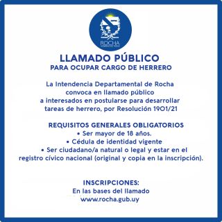 15-09-2021 LLAMADO PÚBLICO PARA OCUPAR CARGOS DE HERRERO La Intendencia Departamental de Rocha convoca en llamado público a interesados en postularse para desarrollar tareas de HERRERO, por Res (...)