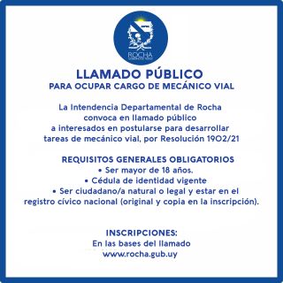 15-09-2021 LLAMADO PÚBLICO PARA OCUPAR CARGOS DE MECÁNICO VIAL La Intendencia Departamental de Rocha convoca en llamado público a interesados en postularse para (...)
