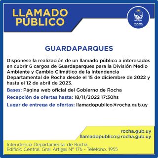 22-11-2022 EL INTENDENTE DEPARTAMENTAL DE ROCHA RESUELVE 1) Dispónese la realización de un llamado público a interesados en cubrir 6 cargos de Guardaparques para la División Medio Ambiente y Cambio Climático de la Intendencia Departamental de Rocha desde el 15 de diciembre de 2022 y hasta el 12 de abril de 2023. Bases al pie de esta publicación. Atención: RECEPCIÓN DE OFERTAS HASTA EL 29 de noviembre de 2022 - Hora: 17:30 (...)