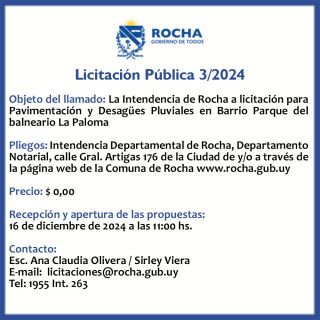21-11-2024 Licitación Pública 3/2024 Objeto del llamado: La Intendencia de Rocha a licitación para Pavimentación y Desagües Pluviales en Barrio Parque del balneario La Paloma Pliegos: Intendencia Departamental de Rocha, Departamento Notarial, calle Gral. Artigas 176 de la Ciudad de y/o a través de la página web de la Comuna de Rocha www.rocha.gub.uy Precio: $ 0,00 Recepción y apertura de las propuestas : 16 de diciembr (...)