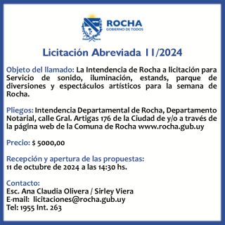 07-10-2024 Licitación Abreviada 11/2024 Objeto del llamado: La Intendencia de Rocha a licitación para Servicio de sonido, iluminación, estands, parque de diversiones y espectáculos artísticos para la semana de Rocha. Pliegos: Intendencia Departamental de Rocha, Departamento Notarial, calle Gral. Artigas 176 de la Ciudad de y/o a través de la página web de la Comuna de Rocha www.rocha.gub.uy Precio: $ 5000,00 Recepción y (...)