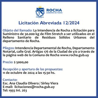 07-10-2024 Licitación Abreviada 12/2024 Objeto del llamado: La Intendencia de Rocha a licitación para Suministro de 30.000 kg de Film Stretch a ser utilizados en el Relleno Sanitario de Residuos Sólidos Urbanos del departamento de Rocha. Pliegos: Intendencia Departamental de Rocha, Departamento Notarial, calle Gral. Artigas 176 de la Ciudad de y/o a través de la página web de la Comuna de Rocha www.rocha.gub.uy Precio: $ 5000,00 Recepci&oacu (...)