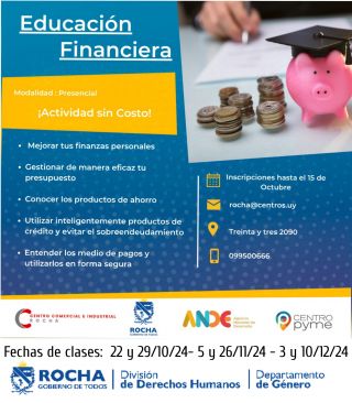 21-10-2024 Atención! Invitación a curso gratuito de Educación Financiera que promovemos desde Departamento de Género para todas las personas interesadas. Consiste en tener los ingresos suficientes para cubrir todas las necesidades económicas. Establecer prioridades, controlar el gasto y trazar una estrategia para generar ingresos resulta clave para conseguir este objetivo al que aspiran muchas personas cuando piensan en su salud financiera Las personas que no adquieren conocimientos afines, generalmente no tienen buenos hábitos de consumo y ahorro, por lo que no cuentan con montos de dinero que sirvan para solventarse habitualmente (...)