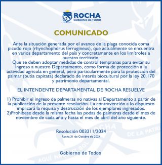 31-10-2024 PROHIBESE EL INGRESO DE PALMERAS NO NATIVAS A ROCHA VISTO la situación generada por el avance de la plaga conocida como picudo rojo (rhynchophorus ferrugineu (...)