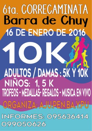 15-01-2016 Las actividades deportivas son una constante esta temporada estival en la costa Atlántica del departamento de Rocha. A la ya promocionada carrera La Paloma Corre 7K nocturna, se le suma la 6ta. edición de la Correcaminata de Barra de Chuy el próximo sábado 16 de eneroa las 18.30 horas. Los participantes en categoría adultos (damas y caballeros) podrán optar por el recorrido de 5 o 10 kilómetros, en tanto que el tramo para los menores (niños) es de 1,5 kilómetros. Con música en vivo y entrega de trofeos, medallas y regalos, culminará el evento deportivo en la tarde noche del balneario fronterizo de nuestro depa (...)