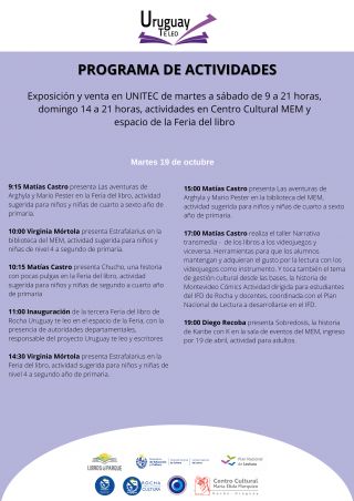 19-10-2021 HOY comenzó la Feria del Libro en los salones de Unitec y el Centro de Arte y Cultura Joven en Callejuela Dagoberto Vaz Mendoza y 19 de abril en la ciudad de Rocha. Ofrecemos la agenda diaria de actividades que se llevarán adelante. Los esperamos !! #Cultura