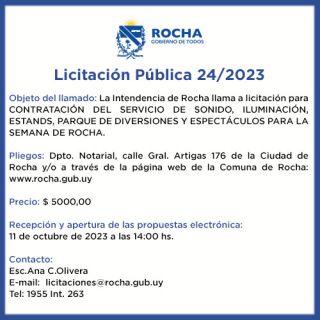 27-09-2023 Licitación Abreviada 24/2023 Objeto del llamado: La Intendencia de Rocha llama a licitación para CONTRATACIÓN DEL SERVICIO DE SONIDO, ILUMINACIÓN, ESTANDS, PARQUE DE DIVERSIONES Y ESPECTÁCULOS PARA LA SEMANA DE ROCHA. Pliegos: Intendencia Departamental de Rocha, Departamento Notarial, calle Gral. Artigas 176 de la Ciudad de y/o a través de la página web de la Comuna de Rocha www.rocha.gub.uy Precio: $ 5000,00
