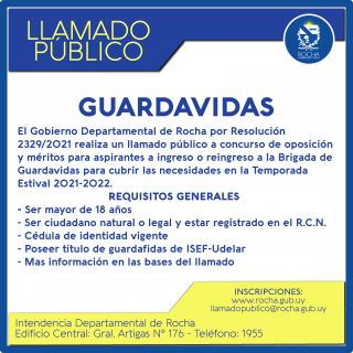 19-11-2021 El Gobierno Departamental de Rocha por Resolución 2329/2021 realiza un llamado público a concurso de oposición y méritos para aspirantes a ingreso o reingreso a la Brigada de Guardavidas para cubrir las necesidades en la Temporada 2021-2022 Bases en el link al pie. Estival 2021-2022.l Gobierno Departamental de Rocha por Resolución 2329/2021 (...)