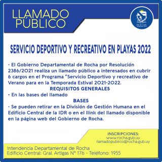 21-11-2021 - El Gobierno Departamental de Rocha por Resolución 2386/2021 realiza un llamado público a interesados en cubrir 6 cargos en el Programa “Servicio Deportivo y recreativo de Verano para en la Temporada Estival 2021-2022. REQUISITOS GENER (...)