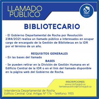 21-11-2021 - El Gobierno Departamental de Rocha por Resolución 2384/2021 realiza un llamado público a interesados en ocupar cargo de encargado de la Gestión de Bibliotecas en la IDR