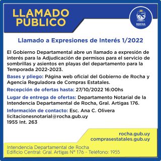 22-10-2022 Llamado a Expresiones de Interés 1/2022 El Gobierno Departamental abre un llamado a expresión de interés para la Adjudicación de permisos para el servicio de sombrillas y asientos en playas del departamento para la Temporada 2022-2023. Bases y pliego: Página web oficial del Gobierno de Rocha y Agencia Reguladora de Compras Estatales. Recepción de ofertas hasta: 27/10/2022 16:00hs Lugar de entrega de ofertas: Departamento Notarial de la Intendencia Departamental de Rocha, Gral. Artigas 176. Información de contact (...)
