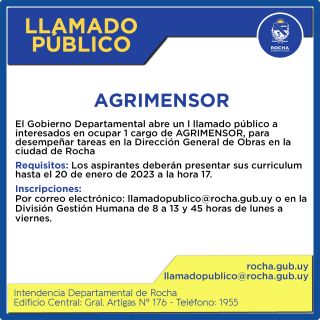 11-01-2023 El Gobierno Departamental abre un llamado público a interesados en ocupar 1 cargo de AGRIMENSOR, para desempeñar tareas en la Dirección General de Obras en la ciudad de Rocha Requisitos: Los aspirantes deberán presentar sus curriculum hasta el 20 de enero de 2023 a la hora 17. Inscripciones: Por correo electrónico: llamadopublico@rocha.gub.uy o en la División Gestión Humana de 8 a 13 y 45 horas de lunes a viernes. (...)