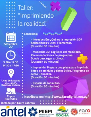 12-09-2019 Estimad@s, el Viernes 27 de Setiembre se estará realizando en la ciudad de Lascano un taller de impresión 3D en las instalaciones del Liceo Mtro. Adolfo Rodriguez Mallarini. El taller denominado "Imprimiendo la Realidad" se realizará en doble turno (de 9:30 a 12:30 y de 14:30 a 17:30) con un cupo máximo de 15 personas por grupo. Las personas interesadas en participar deberán inscribirse previamente en el siguiente enlace:
