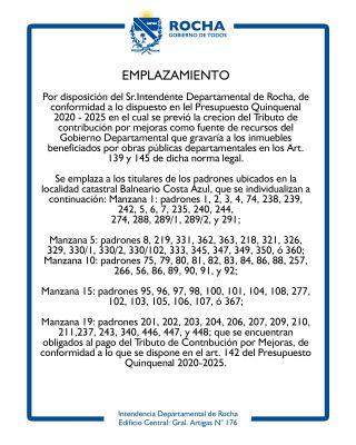 18-01-2024 EDICTO La Intendencia de Rocha, da vista por el plazo de 10 días, a los propietarios, sucesores a cualquier títulos, ocupantes y/o poseedores a cualquier título de los padrones que se indican a continuación, de la resolución del Gobierno Departamental de Rocha dictada en el expediente administrativo correspondiente, respecto a las deudas que mantienen a la fecha por concepto de Tributos Inmobiliarios. Los mencionados expedientes se encuentran disponibles en la Dirección G (...)