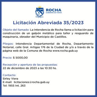 17-12-2023 Licitación Abreviada 35/2023 Objeto del llamado: La Intendencia de Rocha llama a licitación para construcción de un galpón metálico para taller y resguardo de maquinaria, obrador del Municipio de Castillos. Pliegos: Intendencia Departamental de Rocha, Departamento Notarial, calle Gral. Artigas 176 de la Ciudad de y/o a trav&e (...)