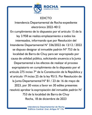 25-12-2023 EDICTO Intendencia Departamental de Rocha-expediente electrónico 2022-4012. 1) En cumplimiento de lo dispuesto por el artículo 15 de la ley 3.958 se realiza emplazamiento a todos los interesados, informando que por Resolución del Intendente Departamental N° 336/2022 de 13/12 / 2022 se dispuso designar al inmueble padrón Nº 753 de la localidad de Barra de Chuy para ser expropiado por causa de utilidad pública, solicitando anuencia a la Junta Departamental a los efectos de realizar el proceso expropiatorio en cumplimiento de lo dispuesto por el artículo 275 inciso 7º de la Constitución de la Rep&uacu (...)