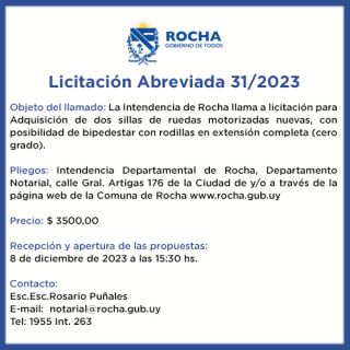 07-12-2023 Licitación Abreviada 31/2023 Objeto del llamado: La Intendencia de Rocha llama a licitación para Adquisición de dos sillas de ruedas motorizadas nuevas, con posibilidad de bipedestar con rodillas en extensión completa (cero grado).