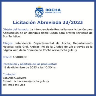 07-12-2023 Licitación Abreviada 33/2023 Objeto del llamado: La Intendencia de Rocha llama a licitación para Adquisición de un ómnibus doble usado para prestar servicios de Bus Turístico.