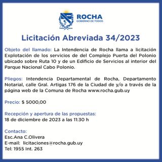 07-12-2023 Licitación Abreviada 34/2023 Objeto del llamado: La Intendencia de Rocha llama a licitación Explotación de los servicios del Complejo Puerta del Polonio ubicado sobre Ruta 10 y de un Edificio de Servicios al interior del Parque Nacional Cabo Polonio. Pliegos: Intendencia Departamental de Rocha, Departamento Notarial, calle Gral. Artigas 176 de la Ciudad de y/o a través de la página web de la Comuna de Rocha www.rocha.gub.uy
