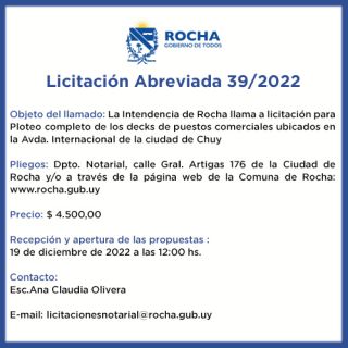 06-12-2022 Licitación Abreviada 39/2022 Objeto del llamado: La Intendencia de Rocha llama a licitación para Ploteo completo de los decks de puestos comerciales ubicados en la Avda. Internacional de la ciudad de Chuy Pliegos: Intendencia Departamental de Rocha, Departamento Notarial, calle Gral. Artigas 176 de la Ciudad de y/o a través de la página web de la Comuna de Rocha www.rocha.gub.uy Precio: $ 4500,00 Recepción y apertura de las propuestas : 19 de diciembre de 2022 a las 12:00 hs. Contacto: Esc. Ana C. Olivera E-mail: licitacionesnotarial@rocha. (...)