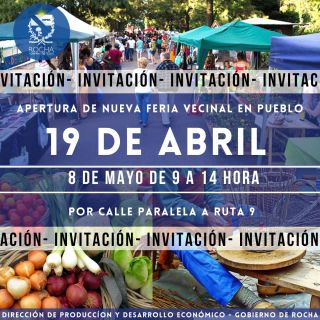 21-04-2021 Se invita a la apertura de la nueva feria vecinal en Pueblo 19 de Abril Se realizá a partir del Sábado 8 de Mayo ( dos sábados al mes), en el horario de 9 a 14 horas, en calle paralela a la ruta 9. (...)