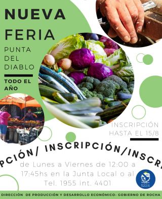 03-08-2021 LLAMADO A INSCRIPCIÓN DE NUEVAS FERIAS VECINALES DE ROCHA Y PUNTA DEL DIABLO La Dirección de Producción y Desarrollo Económico se encuentra realizando el llamado a integrar dos nuevas ferias vecinales. ROCHA: Durante el mes de agosto, se podrán inscribir aquellos interesados en formar parte de la nueva Feria Vecinal en Barrio Machado. Las inscripciones se realizan de lunes a viernes de 12:00 a 17:45 Hs en el local de la Dirección de Producción en calles Peri y Ansina. Por más información al teléfono 1955 int. 204 PUNTA DE (...)