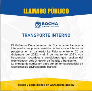 29-12-2022 Llamado Público a interesados en prestar el servicio de transporte interno de pasajeros en el Balneario La Paloma entre el 20 de diciembre de 2022 y el 5 de marzo de 2023, con las frecuencias, recorridos y condiciones que resultan del memorandum de la Dirección de Tránsito y Transporte que forma parte de la presente resolución adjunto al pie de esta publicación. Presentarse en las Oficinas de Tránsito y Transporte. (...)