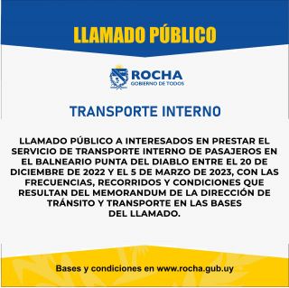 29-12-2022 Llamado Público a interesados en prestar el servicio de transporte interno de pasajeros en el Balneario Punta del Diablo entre el 20 de diciembre de 2022 y el 5 de marzo de 2023, con las frecuencias, recorridos y condiciones que resultan del memorandum de la Dirección de Tránsito y Transporte que forma parte de la presente resolución adjunto al pie de esta publicación. Presentarse en las Oficinas de Tránsito y Transporte. (...)