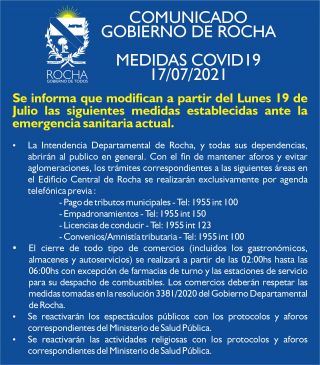 16-07-2021 COMUNICADO GOBIERNO DE ROCHA MEDIDAS COVID19 - 17/07/2021 Se informa que modifican a partir del Lunes 19 de Julio las siguientes medidas establecidas ante la emergencia sanitaria actual. La Intendencia Departamental de Rocha, y todas sus dependencias, abrirán al publico en general. Con el fin de mantener aforos y evitar aglomeraciones, los trámites correspondientes a las siguientes áreas en el Edificio Central de Rocha se realizar&aac (...)